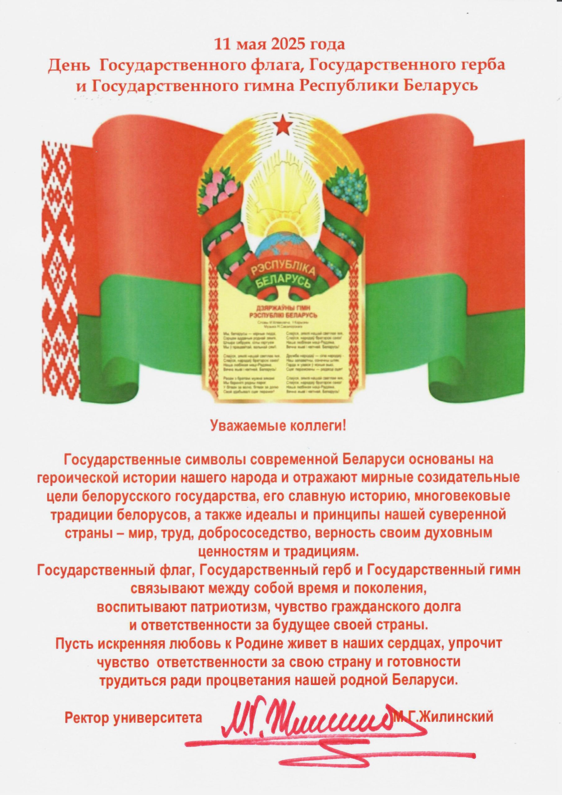 Герб и флаг являются главными символами нашей страны. Это история и будущее белорусского государства, воплощение идеи национального единства, важнейшие атрибуты суверенитета и независимости Отечества.