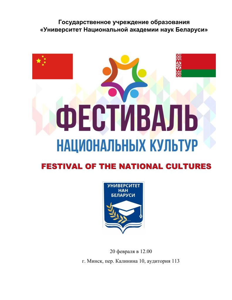 С целью укрепления межнациональных культурных связей, популяризации самобытных национальных культур и формирования культуры межнационального общения в Университете НАН Беларуси пройдёт «Фестиваль национальных культур», в котором примут участие магистранты из Китайской Народной Республики и Республики Беларусь. Мероприятие запланировано на 20 февраля по адресу: пер. Калинина, 10, в 12.00, в 113 аудитории.