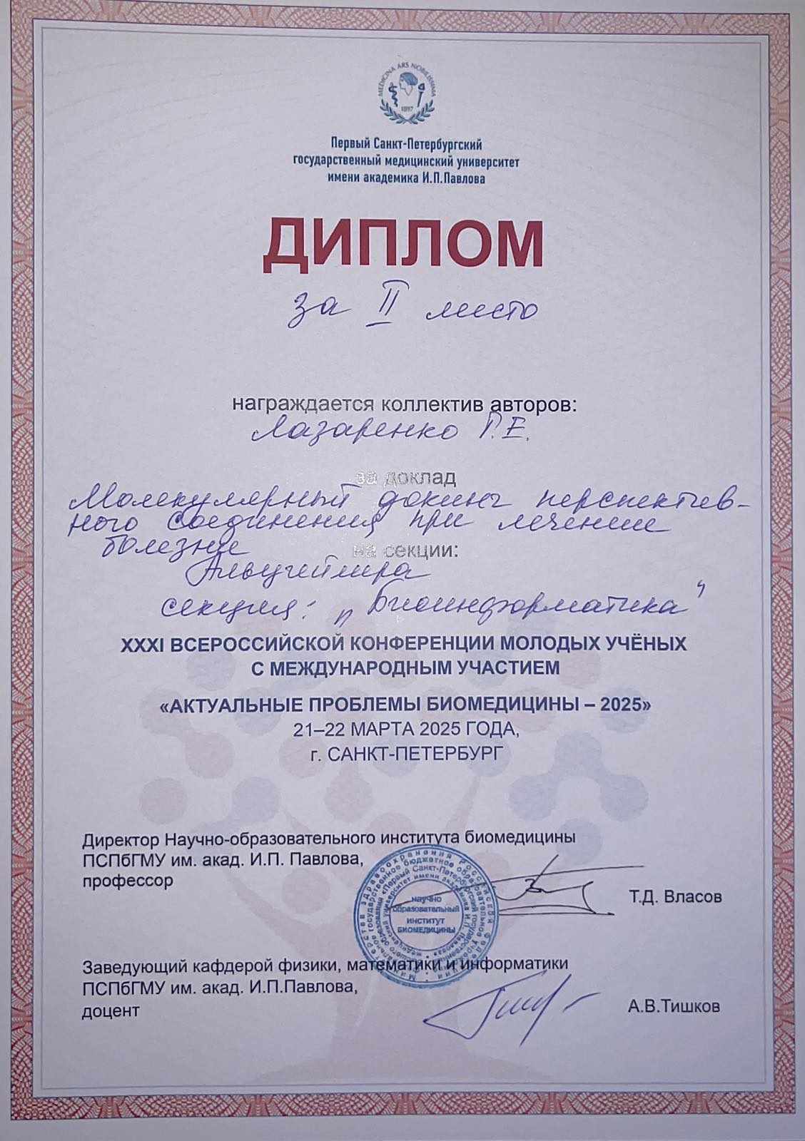 По итогам XXXI Всероссийской конференции молодых учёных с международным участием «Актуальные проблемы биомедицины – 2025», состоявшейся в Первом Санкт-Петербургском медицинском университете имени академика И.П. Павлова 21-22 марта 2025 г., магистрант специальности «Биология» Университета НАН Беларуси Лазаренко Габриэлла Евгеньевна награждена Дипломом за II место. Высокую оценку получило представленное исследование на тему «Молекулярный докинг перспективного соединения при лечении болезни Альцгеймера», которое было выполнено в рамках апробации результатов магистерской диссертации. Научным руководителем молодого учёного является доктор химических наук, профессор Шахаб Сиямак Насер.