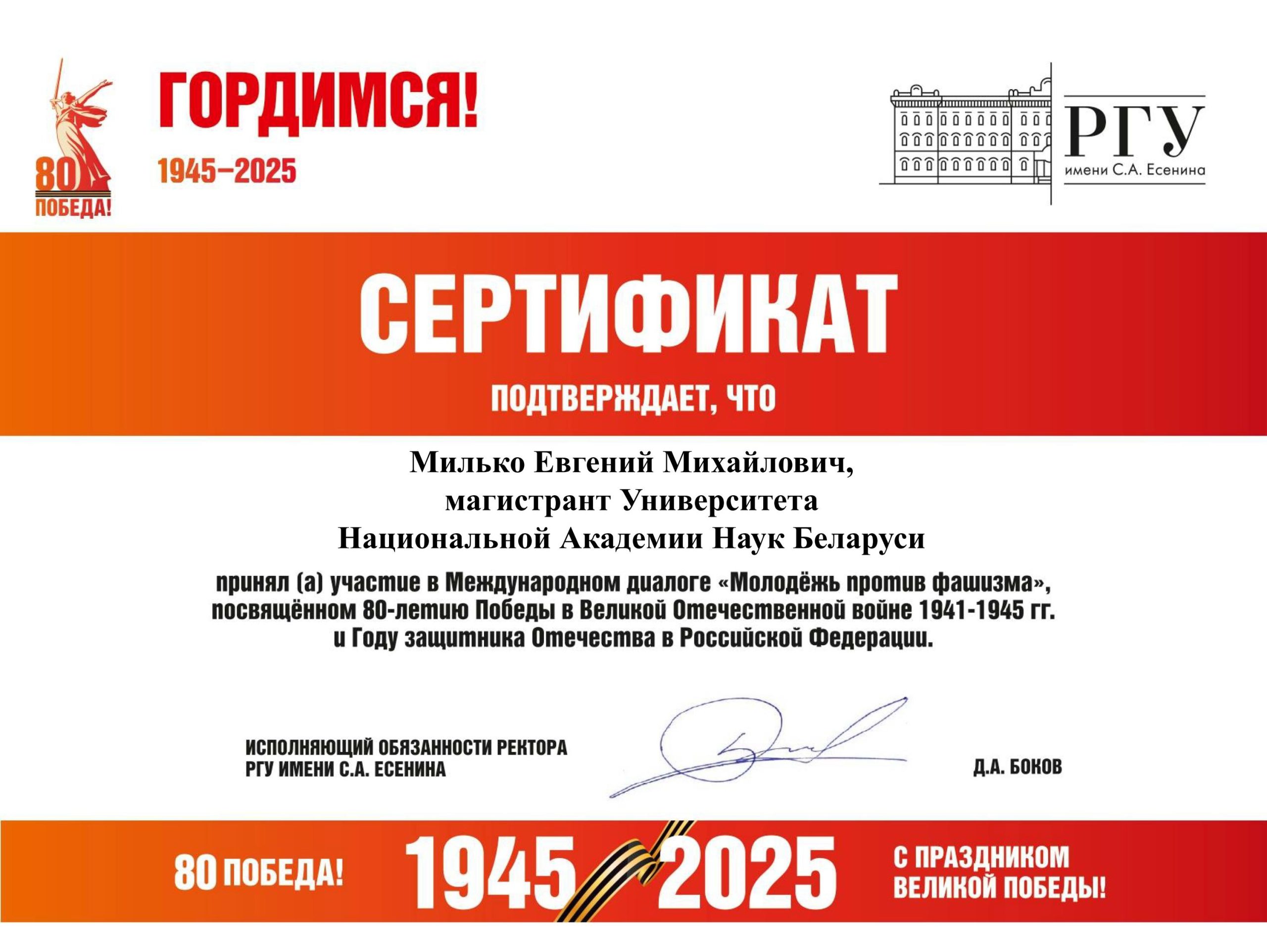 Магистрант Университета НАН Беларуси специальности «Экономика» Милько Евгений Михайлович принял участие в работе Международного молодёжного диалога «Молодёжь против фашизма», посвящённого 80-летию Победы и Году Защитника Отечества в Российской Федерации. Диалог проходил на базе Рязанского государственного университета имени С. Есенина 10 апреля.