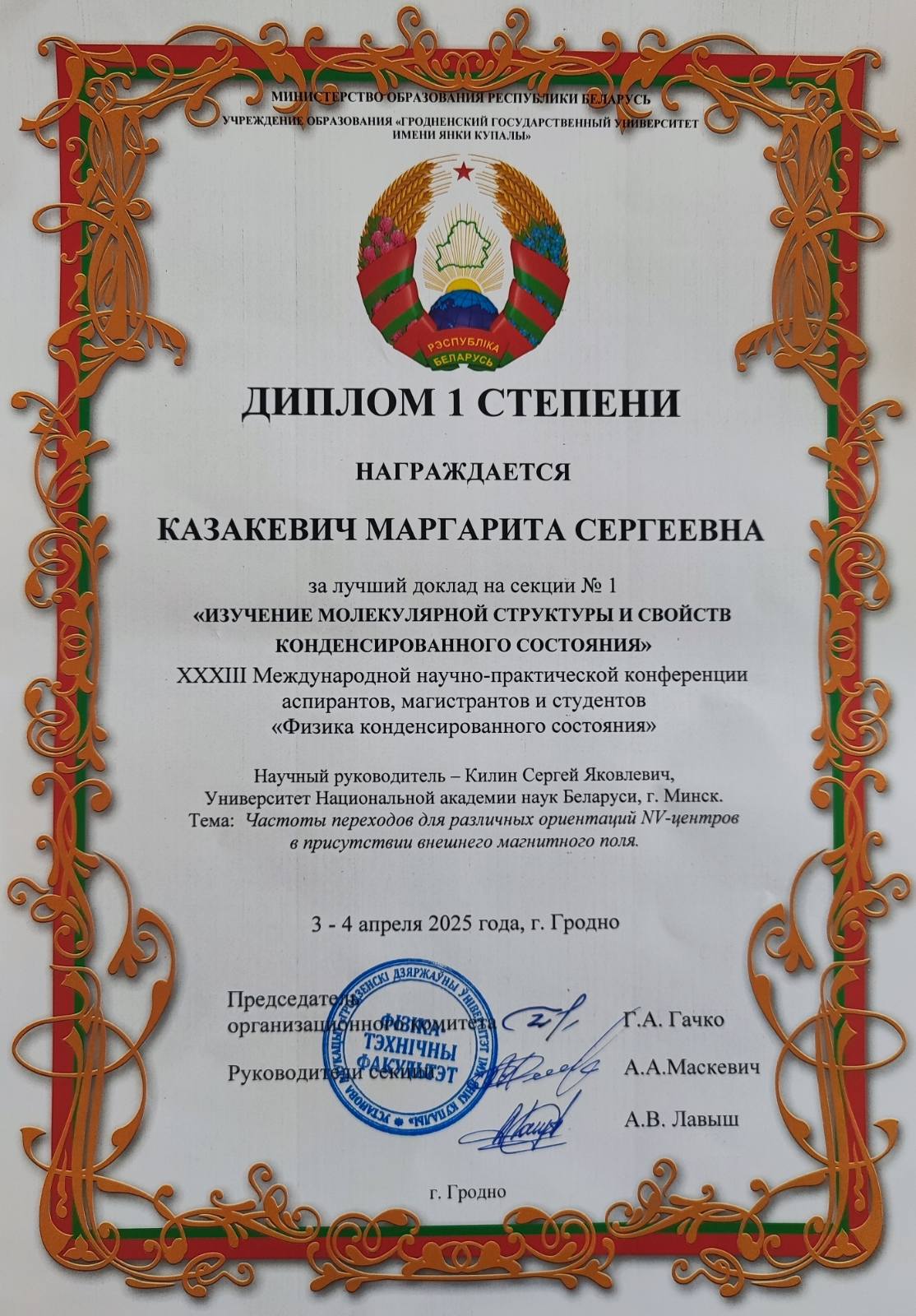 По итогам XXXIII Международной научно-практической конференции аспирантов, магистрантов и студентов «Физика конденсированного состояния», проходившей 3-4 апреля в г.Гродно, дипломом I степени награждена за лучший доклад в секции №1 «Изучение молекулярной структуры и свойств конденсированного состояния» магистрантка 2 курса Университета НАН Беларуси специальности «Физика» Казакевич Маргарита Сергеевна (научный руководитель – доктор физико-математических наук, академик НАН Беларуси С.Я. Килин).