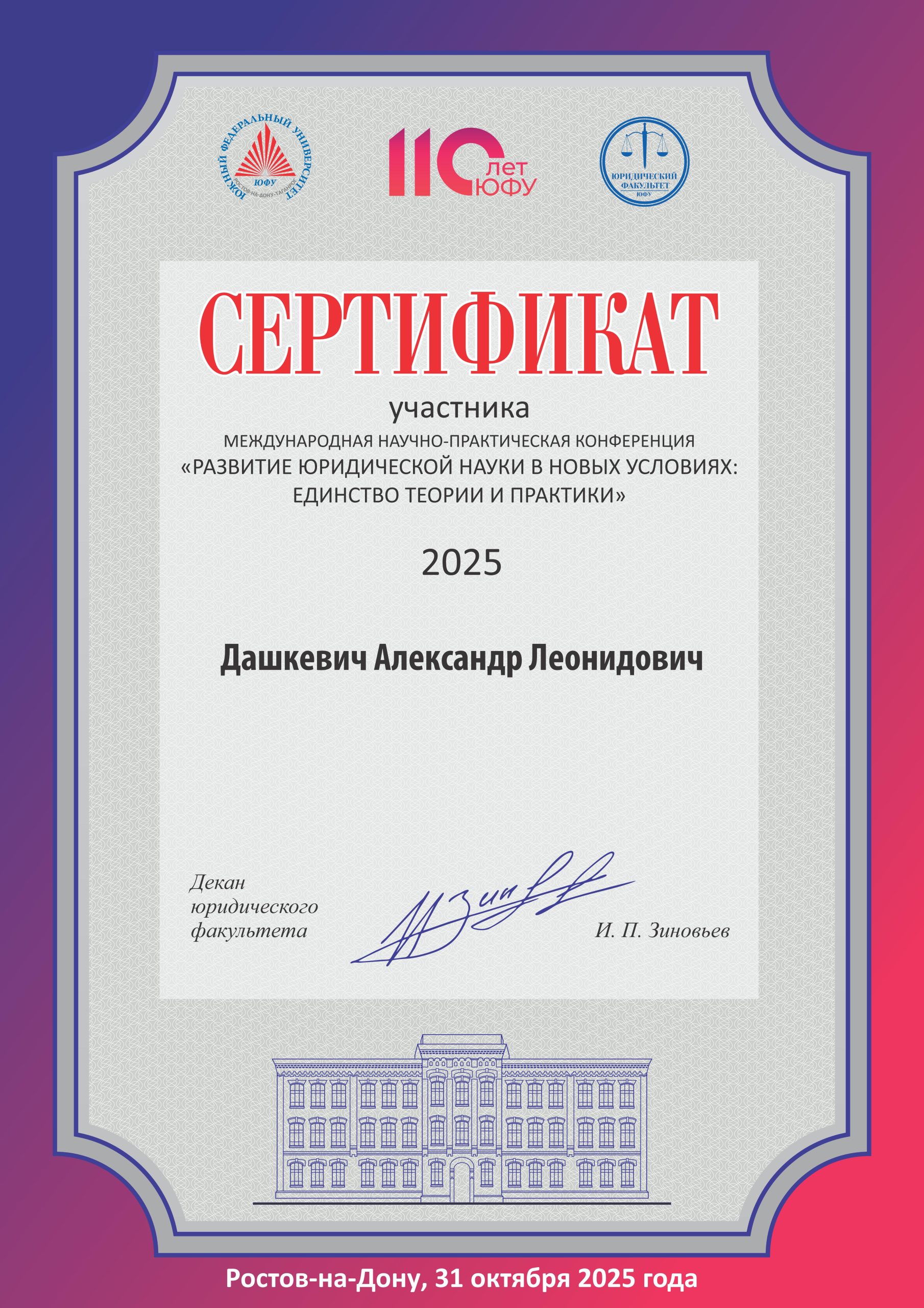 31 октября 2025 г. состоялась Всероссийская научно-практической конференции с международным участием «Развитие юридической науки в новых условиях: единство теории и практики – 2025», организованная юридическим факультетом Южного федерального университета (Российская Федерация, г. Ростов-на-Дону). В рамках заседания научной площадки «Трансформация норм международного публичного и международного частного права в условиях формирования нового мирового правопорядка» в работе конференции принял участие заведующий кафедрой Университета НАН Беларуси Александр Дашкевич с докладом «Права и обязанности экологических общественных объединений: международно-правовые и конституционно-правовые аспекты».
