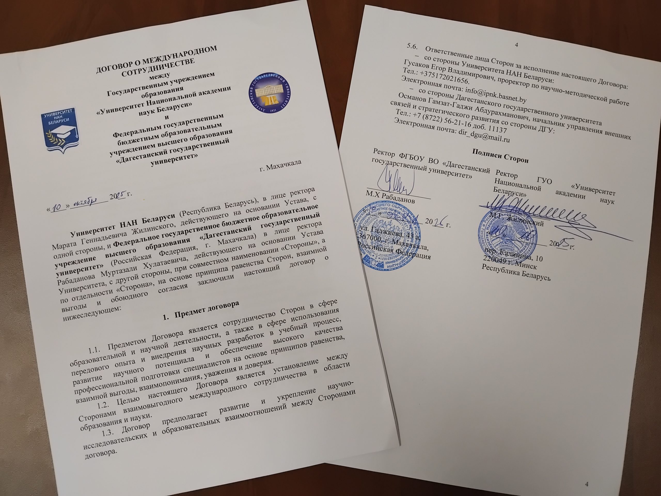 В рамках конференции ректор Университета НАН Беларуси Марат Жилинский и ректор Дагестанского государственного университета Мартазали Рабаданов подписали договор о международном сотрудничестве, предусматривающий развитие академических связей, проведение совместных исследований и обмен преподавателями и студентами. Подписание данного соглашения стало важным шагом в укреплении научных и образовательных связей между университетами Беларуси и Дагестана.