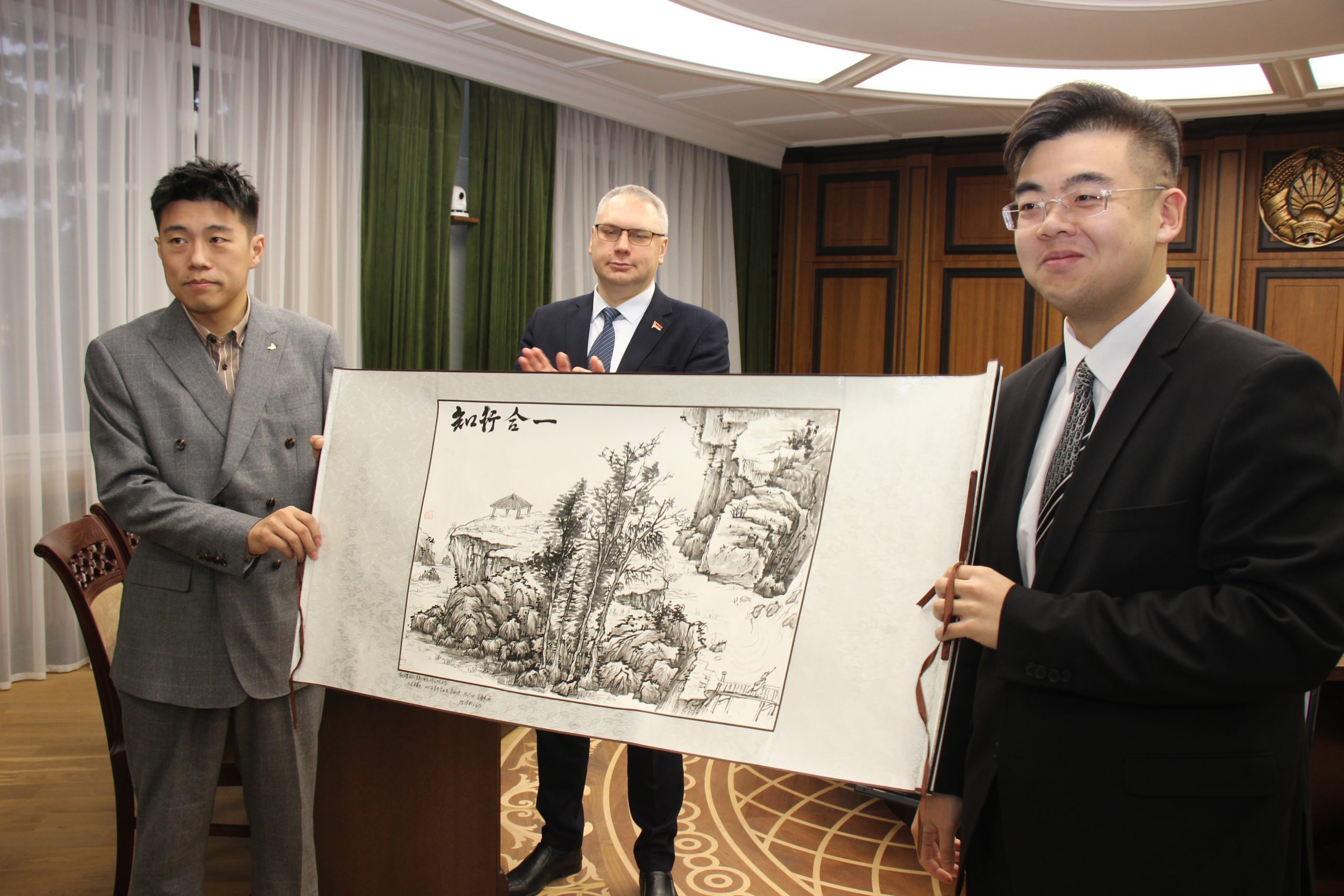 Магистранты преподнесли сувенир Университету в виде живописи на шёлке. Церемония завершилась общей фотографией на ступенях Президиума НАН Беларуси.